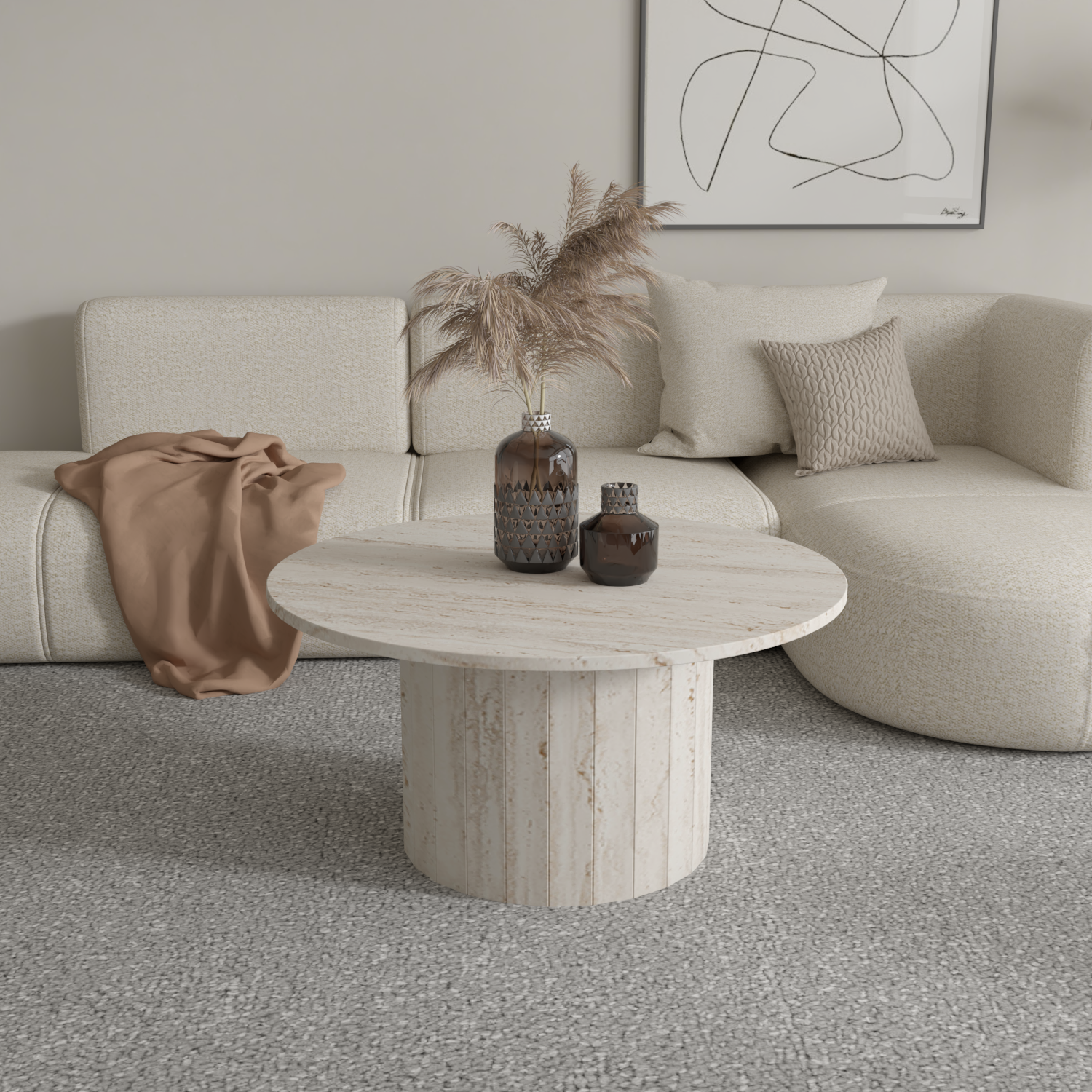 This refined centrepiece boasts a 90cm diameter travertine top, showcasing natural veining that exudes timeless allure. Supported by a single, meticulously crafted base, its design seamlessly blends modern aesthetics with classic charm. The table's sleek silhouette and sturdy construction make it a perfect fit for any contemporary living space, offering both style and functionality in one exquisite piece. Elevate your home décor with the Grecian Coffee Table—a captivating fusion of elegance and practicality, destined to redefine your coffee table experience.