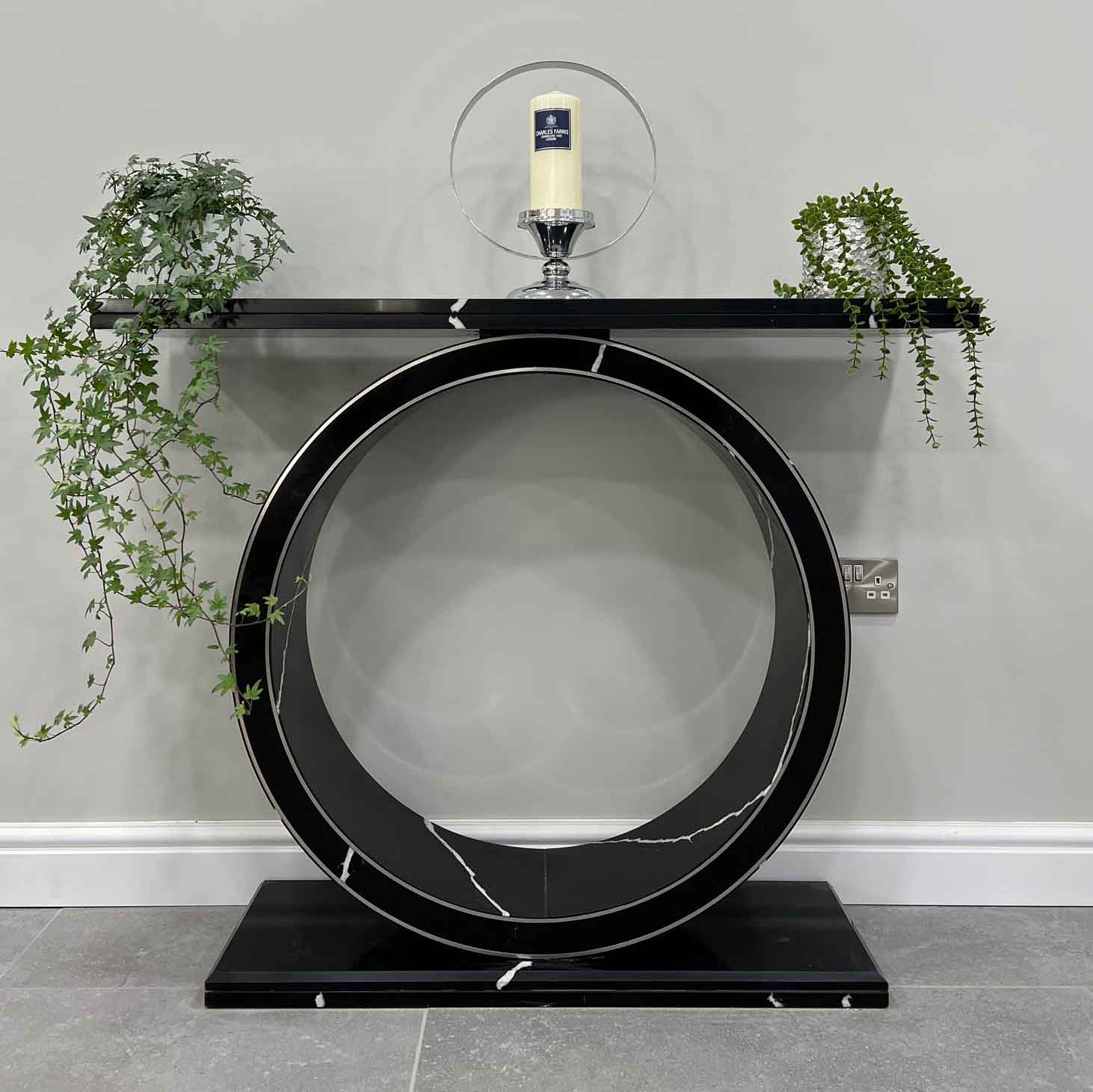 A truly unique and sleek styled console table with large circle that defies the eye to create an impression in any setting.