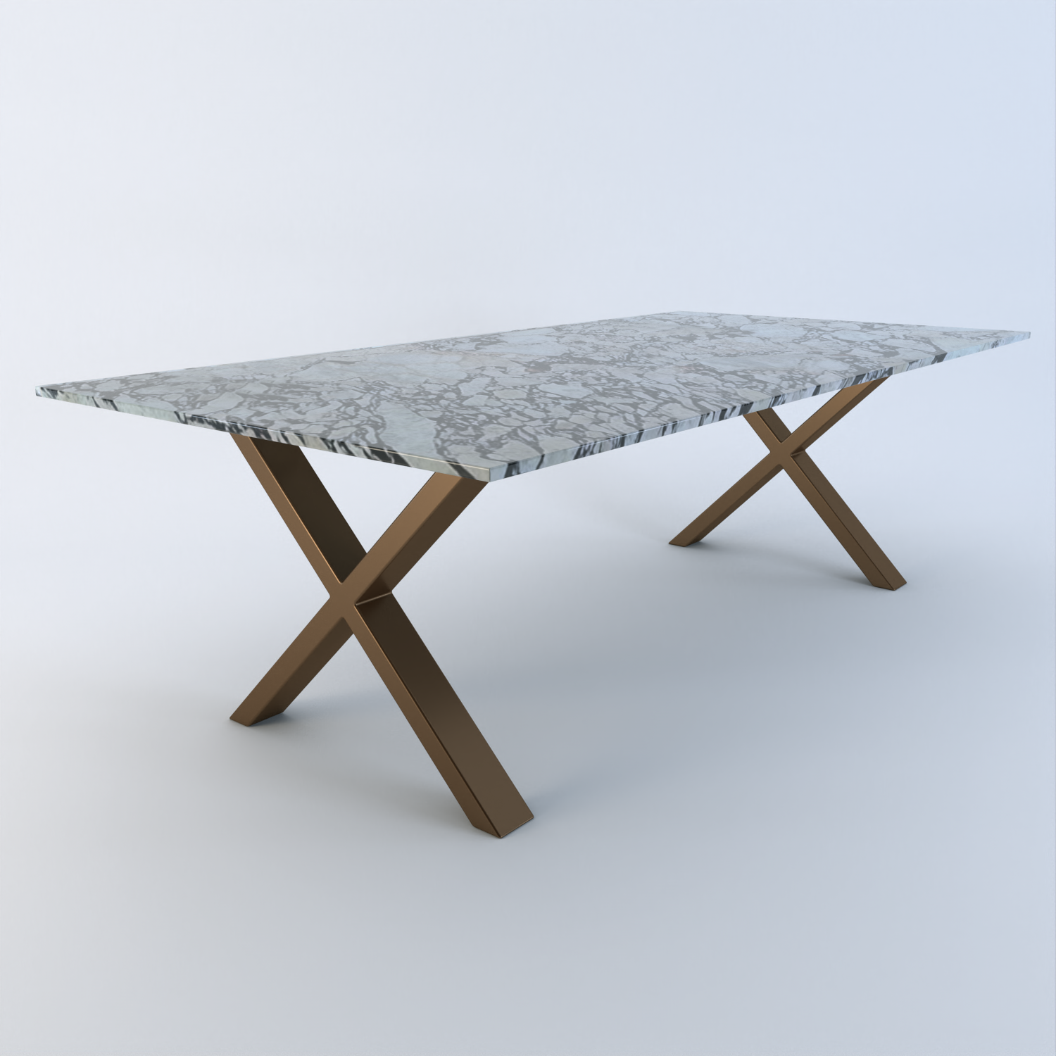 A traditional X frame that works in any kitchen, dining or office setting. We utilise a hidden frame support meaning that there are no unsightly supporting bars running underneath the table top that restrict legroom.