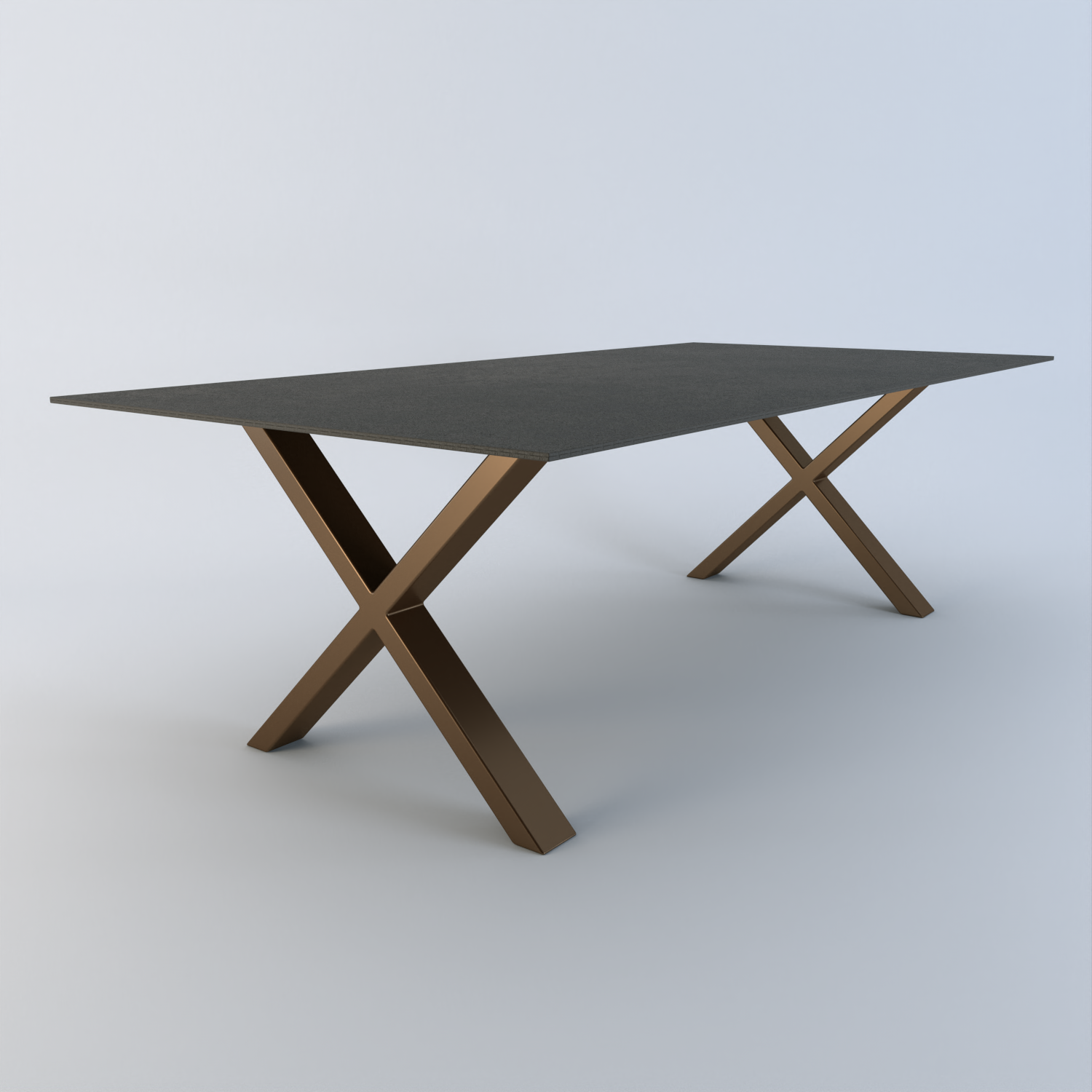A traditional X frame that works in any kitchen, dining or office setting. We utilise a hidden frame support meaning that there are no unsightly supporting bars running underneath the table top that restrict legroom.