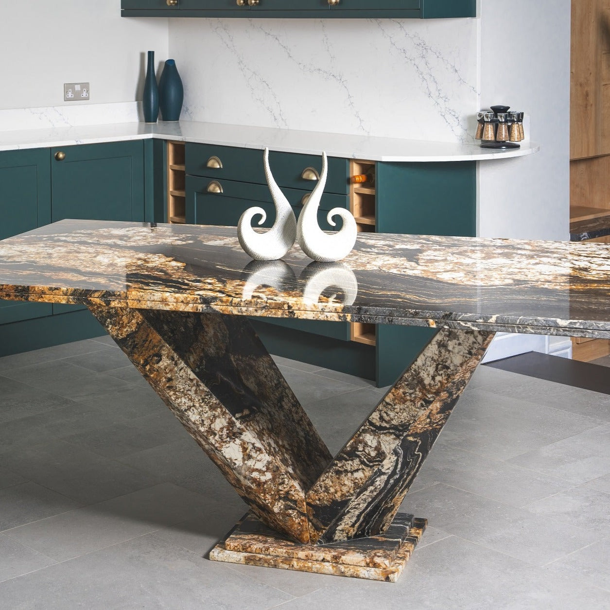 The Vittoria Granite Dining Table commands attention with its elegant natural stone tabletop resting on a striking angular base that seems to float effortlessly. This stunning design enhances any contemporary or traditional space, where the choice of material and colour truly defines the table’s distinctive character and appeal.